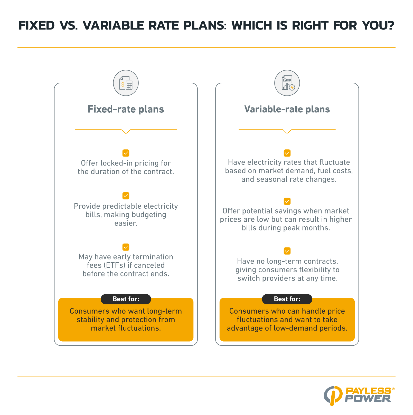 Choosing between a fixed-rate or variable-rate electricity plan depends on whether you prefer price stability or potential savings. Consider the following aspects of each option: