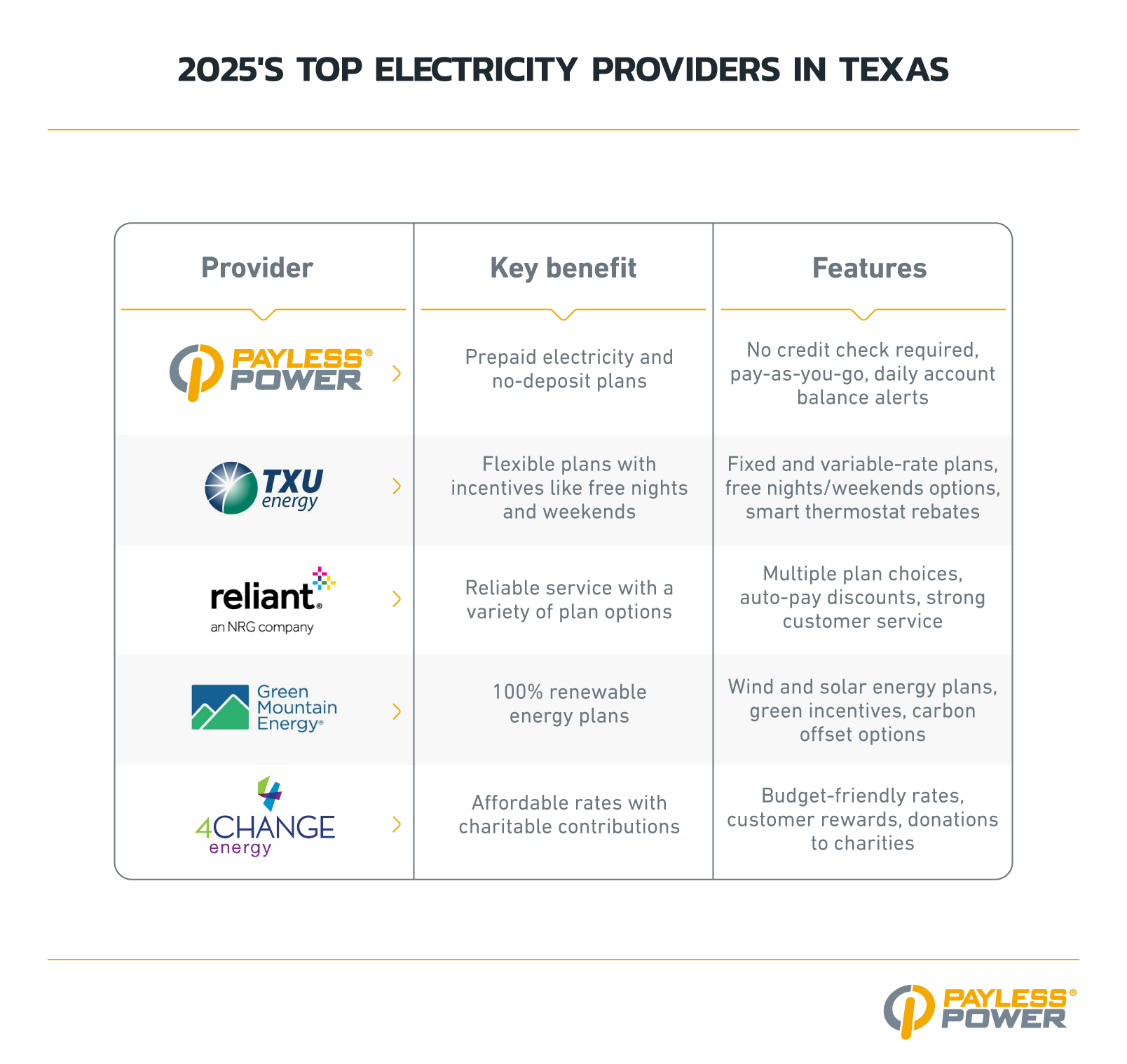 The following table highlights the top electricity providers in Texas based on customer needs, from prepaid options to renewable energy plans: