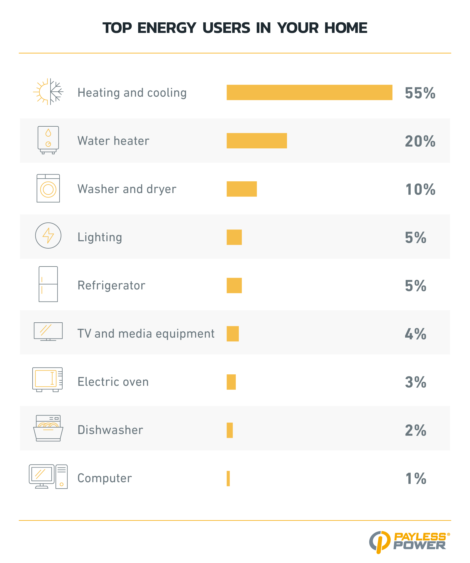 - Electric oven (3%). Use smaller appliances when possible, avoid preheating unnecessarily, and cook during cooler times of day.