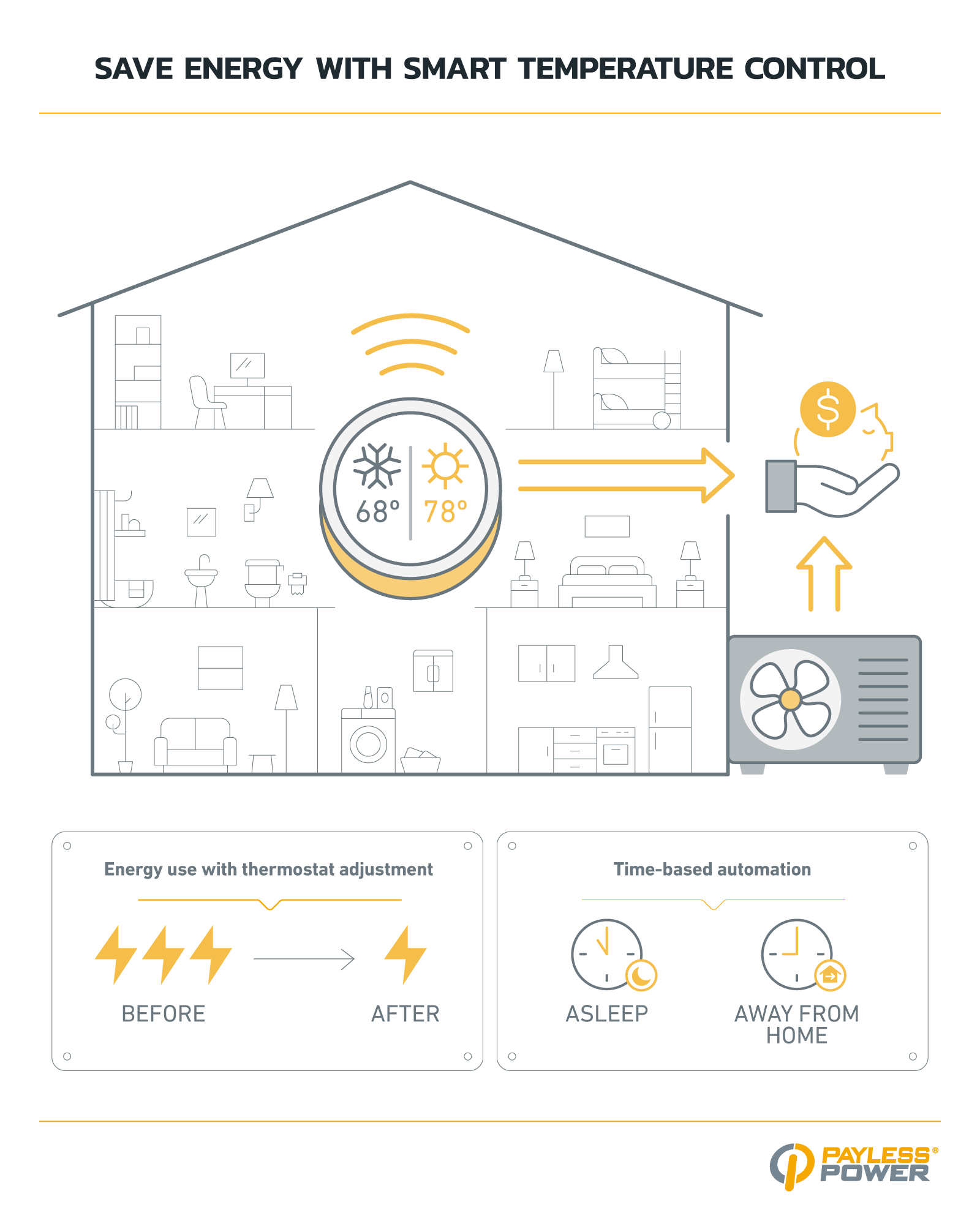 - Set your thermostat to 78°F when at home and higher when away.
