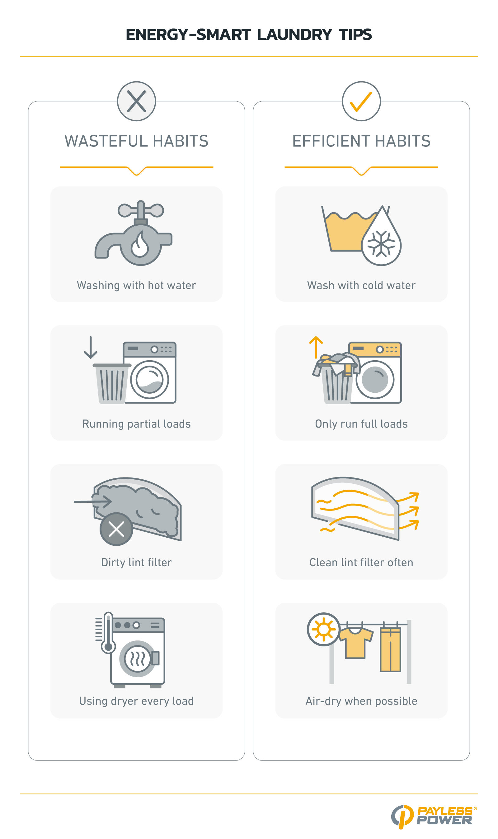 Laundry is one of the most routine energy-using tasks in any home. Improving how you use your washing machine and clothes dryer can help you save electricity at home and cut back on unnecessary electricity usage.