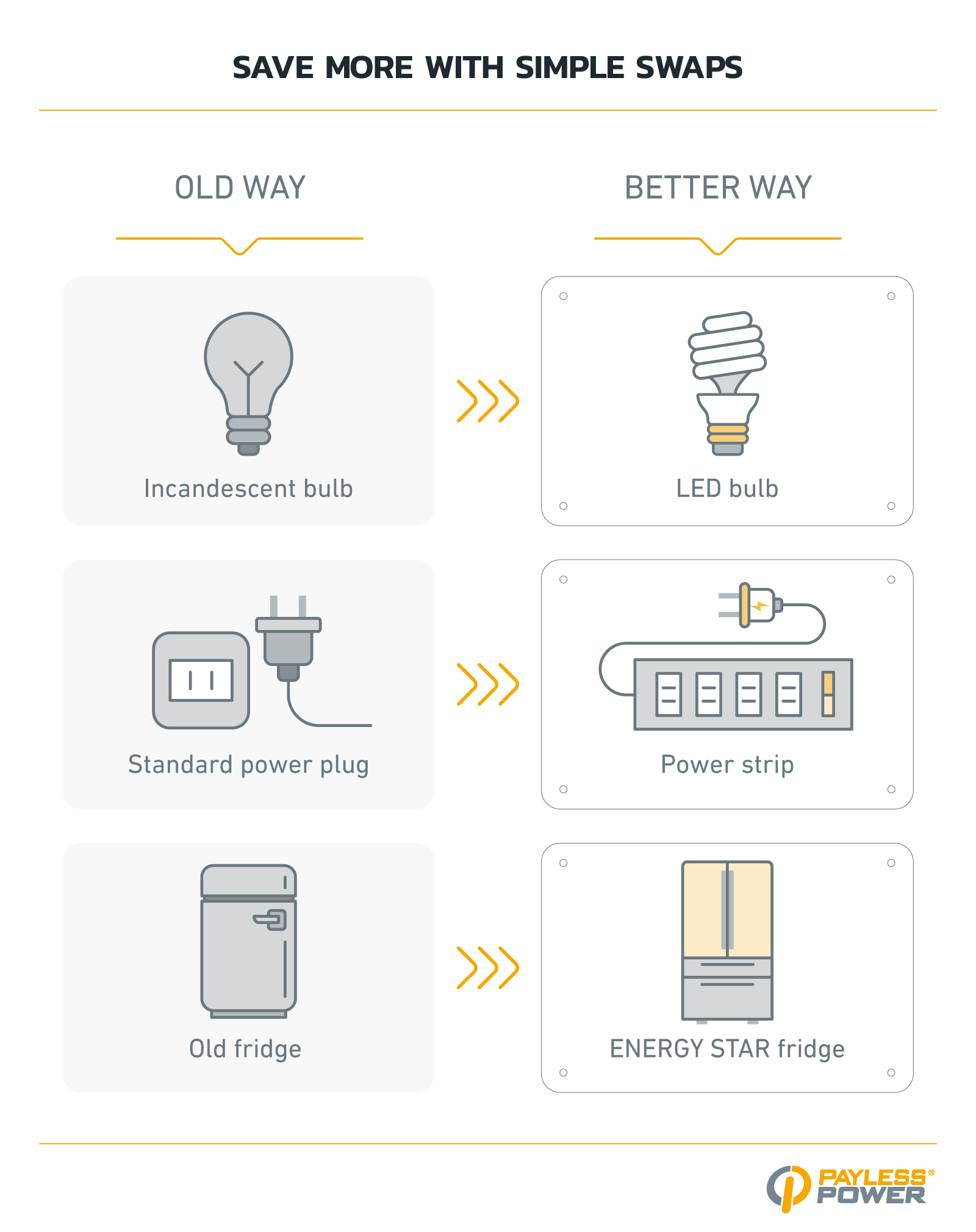 - Use a power strip. Electronics like the toaster and TV continue to draw power in standby mode — shutting them off at the strip prevents wasted energy.