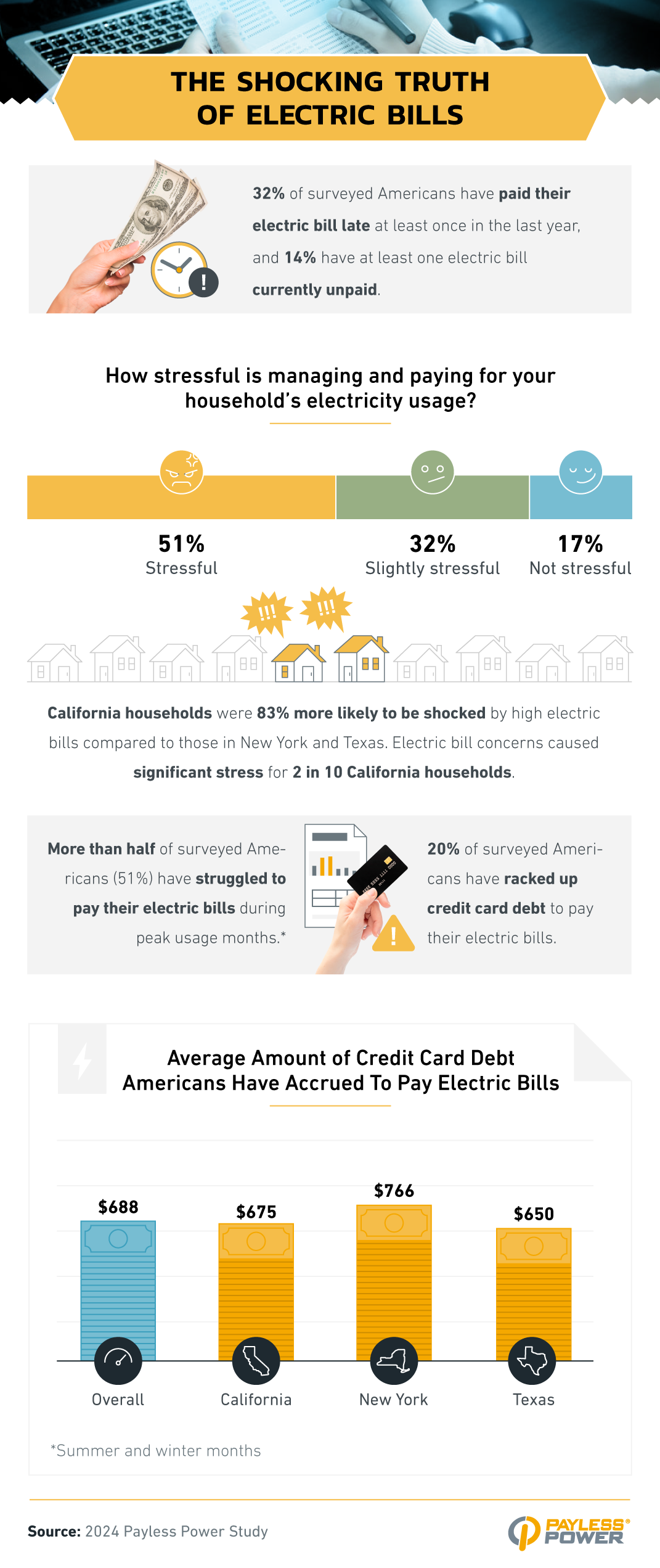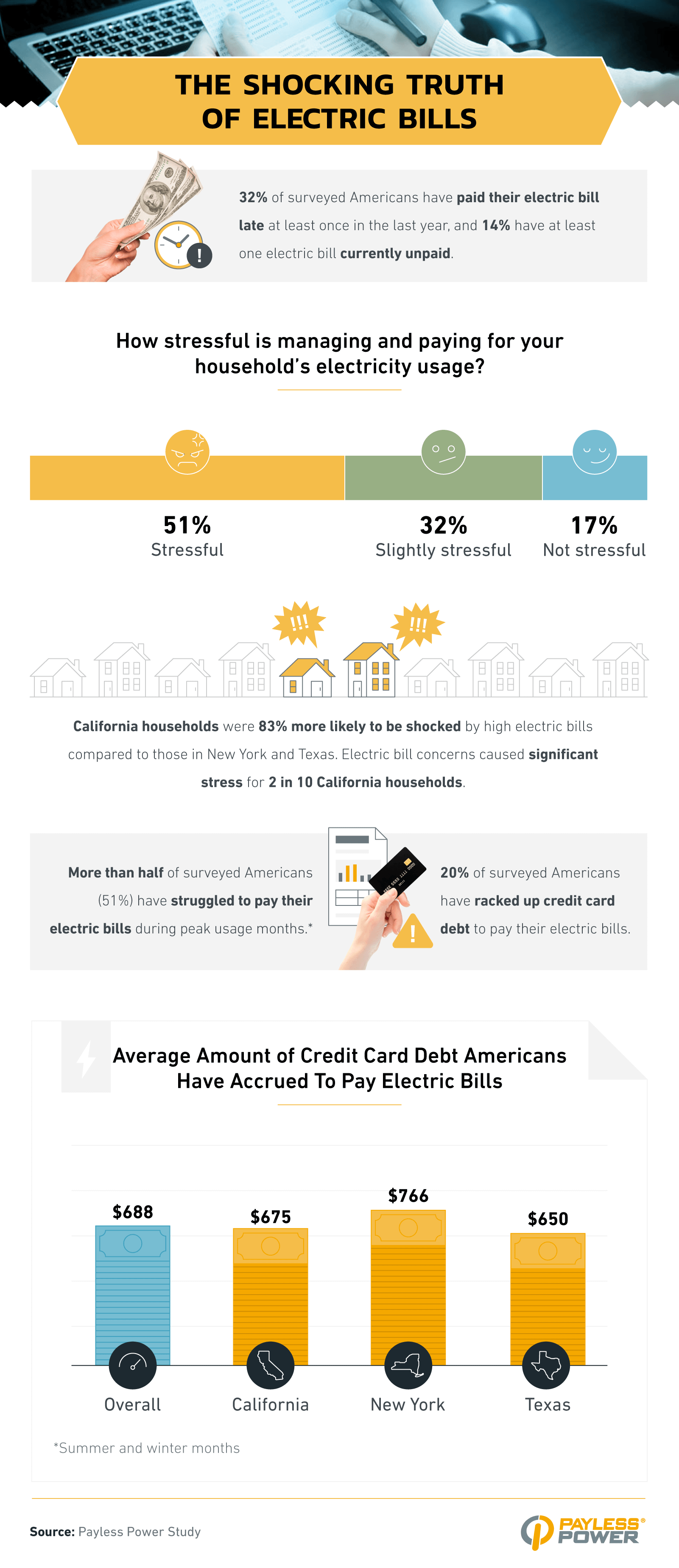 - 20% of surveyed Americans have racked up credit card debt to pay their electric bills; on average, they’ve acquired $688 of credit card debt.