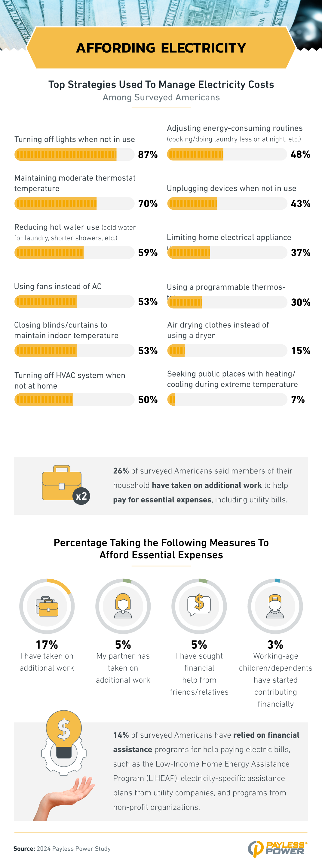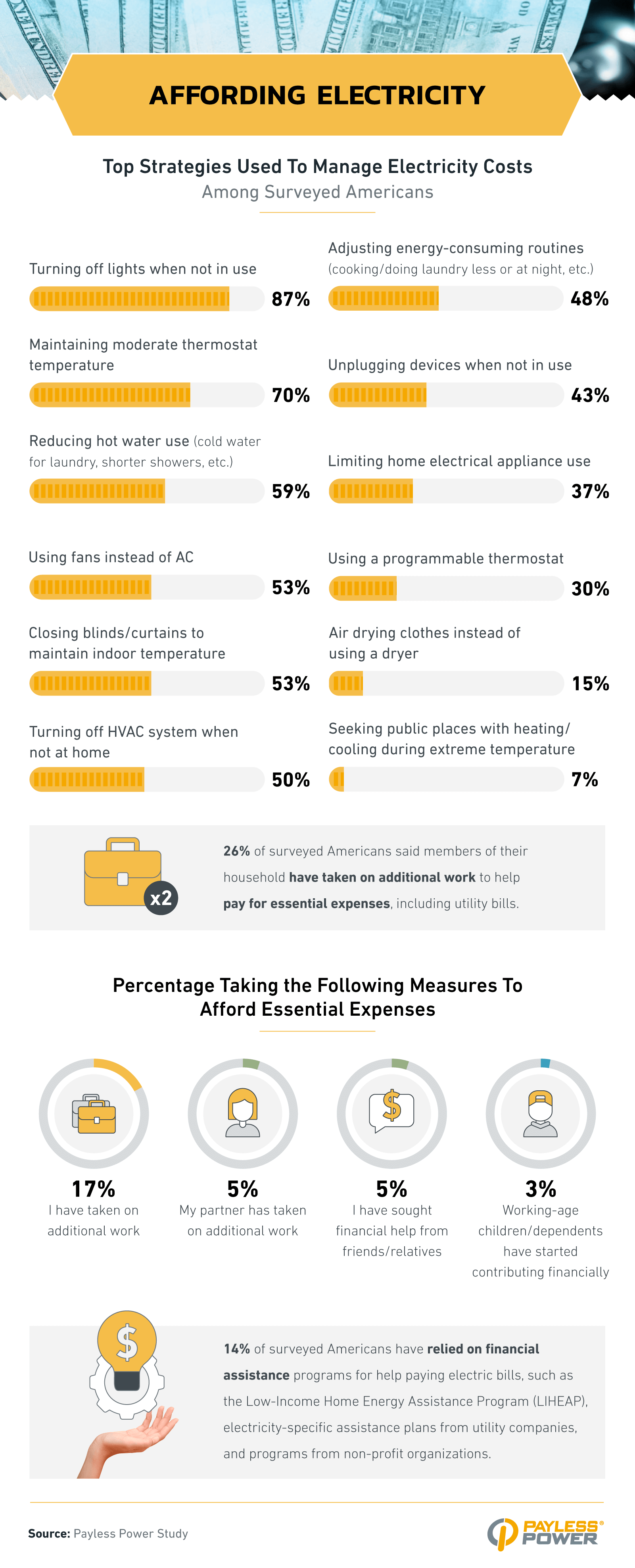 - 26% of surveyed Americans say members of their household have taken on additional work to help pay for essential expenses, including utility bills.