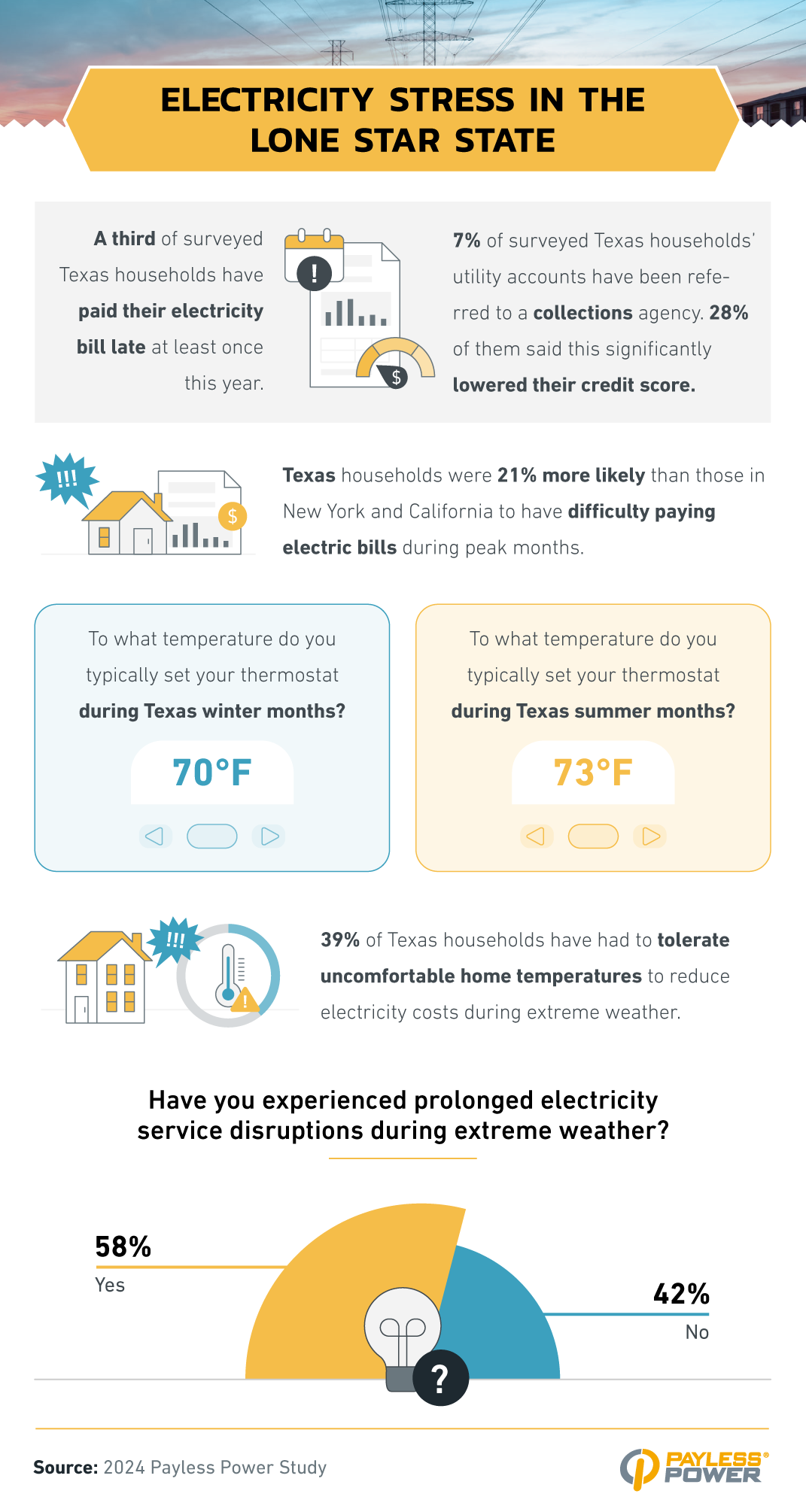 Affording electricity bills during peak months was notably harder in Texas than in the other states we studied — Texas households were 21% more likely than New York and California households to find paying their electric bills difficult during summer and winter months. The extreme weather Texans have faced lately has exacerbated this issue, leading 39% of these households to endure uncomfortable temperatures to reduce electric costs. Case in point: 58% have faced prolonged service disruptions during these extreme weather events, knocking out heat in the cold winter and air conditioning in the hot summer.