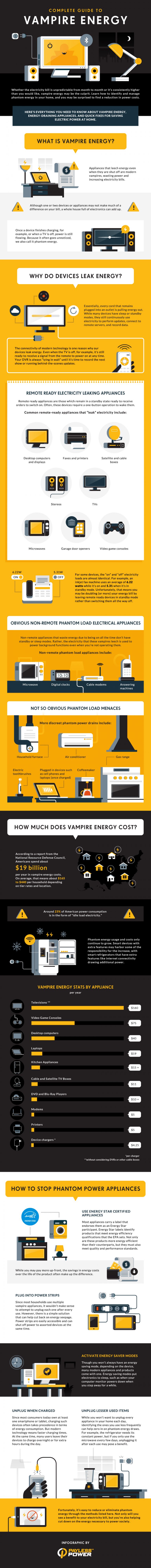 Vampire power (also called phantom power or standby mode), in which appliances consume energy even when they are shut off, can account for up to 20% of your monthly electricity bill. While sitting unused and idle, your TV or toaster oven is sucking money right out of your pocketbook.